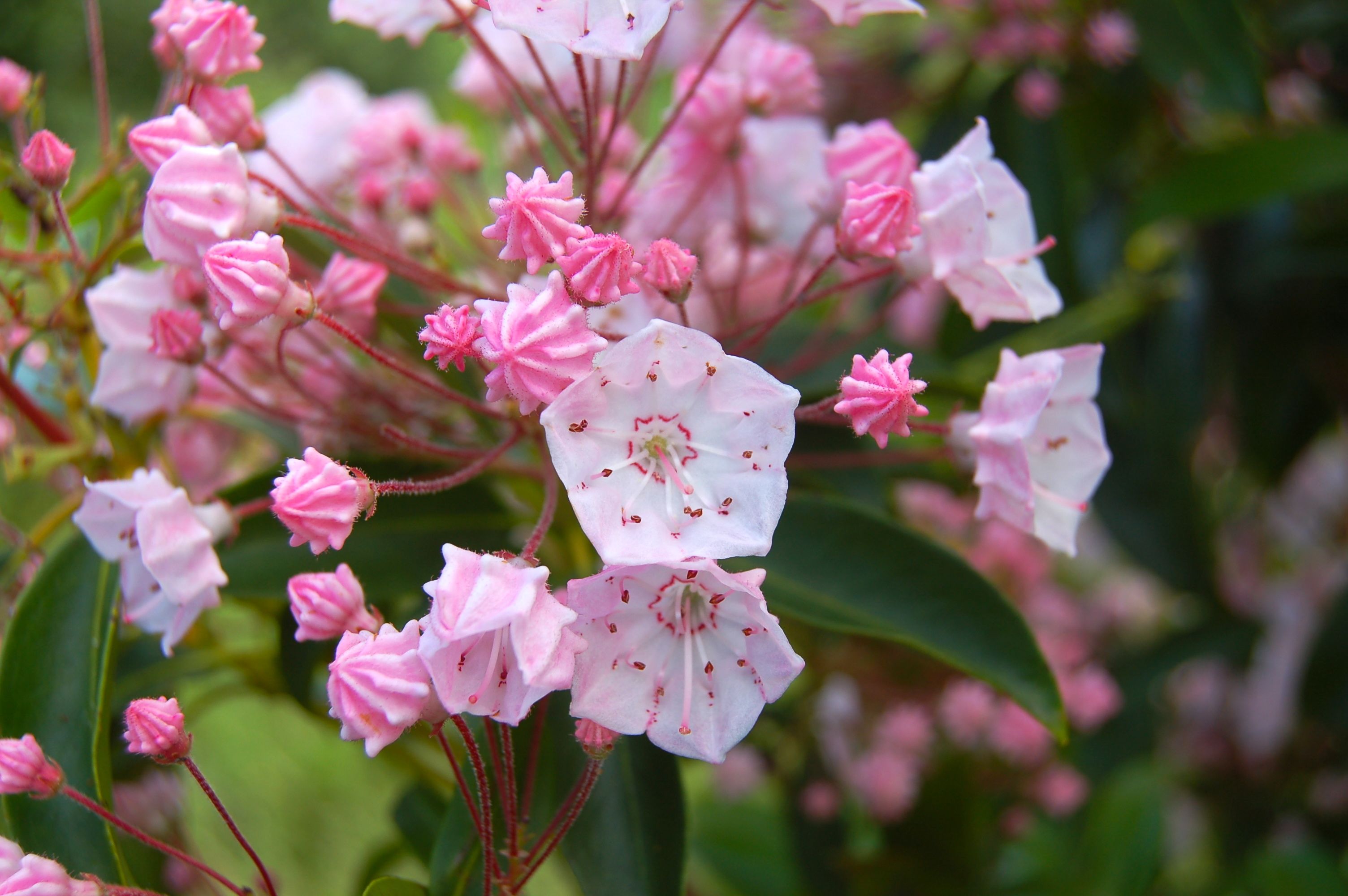 Pink mountain laurel flowers in Massie Gap, along Rhododendron trail to Mt. Rogers, VA on andreabadgley.com