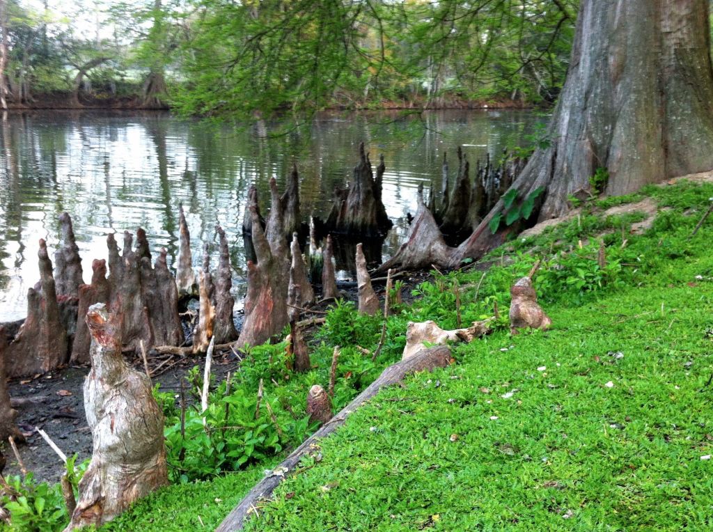 Cypresses have knees too. I’ve always loved that term — cypress knees. They stick up out of the ground, gnarled with bark and knobs, while the remainder of the cypress roots are submerged. The knees protrude above the land — and the water — breaking the surface so the tree can breathe in lowlands prone to flooding.