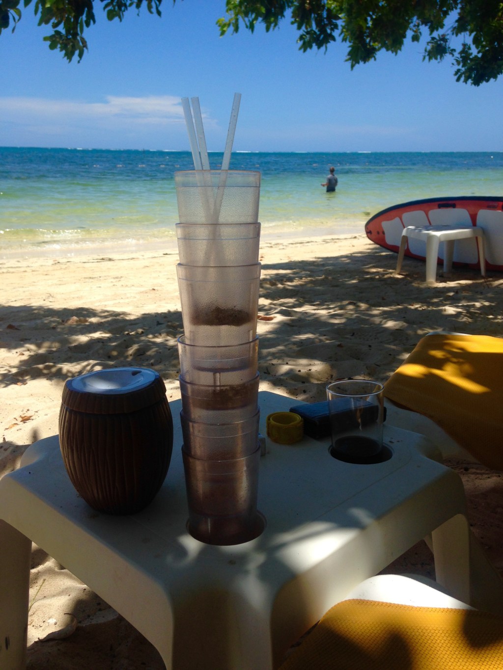 Tomorrow we will park ourselves on the beach all day again. We’ll visit our other friend, Patrice, who is the beach bartender and who makes amazing Bloody Marys. She smiles a huge happy smile every time we bring our empty coconuts* to her for refill. She laughs with us and calls us baby and honey, and I’m glad we have one more day with her. She was upset with us today that we didn’t come see her again yesterday afternoon when we said we would. We won’t make that mistake again.