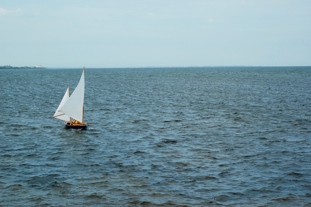 I pointed to a mark on the horizon, out in the sound. “There, that structure.” We turned, and sailed toward the mark I’d chosen. The tiller became more natural. I didn’t react as badly to the boat tipping. I held a steady course.