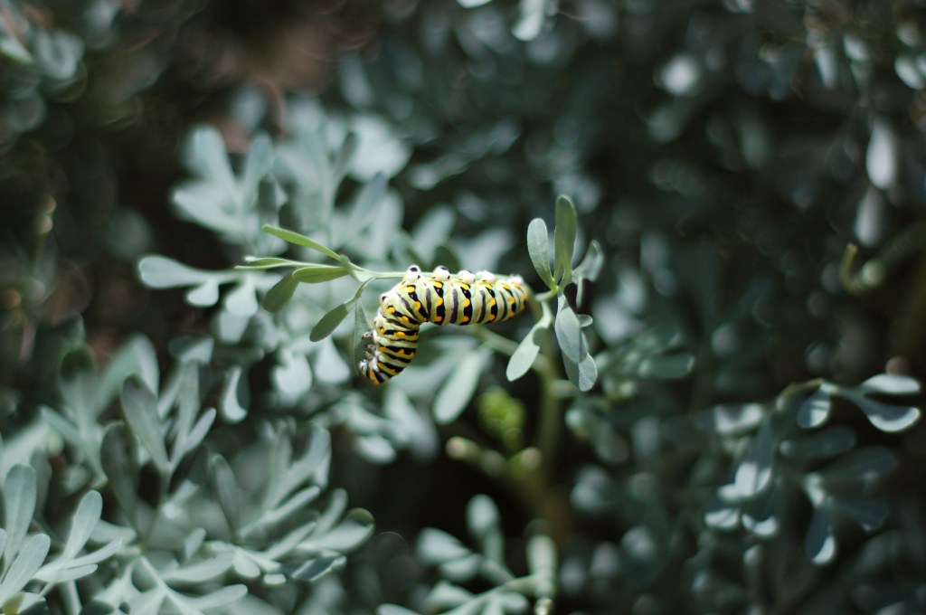 Rue (Ruta graveolens): This is possibly my favorite addition to the garden. The leaves are a silvery blue-green, the plant stays neat and tidy (it doesn’t get leggy or messy), it can take the heat (and drought) and still look healthy, and the swallowtail caterpillars adore it. As an unexpected bonus, the monarch caterpillars love it for building chrysalises. We’ve found at least 3 chrysalises in the small, shin-high plants.