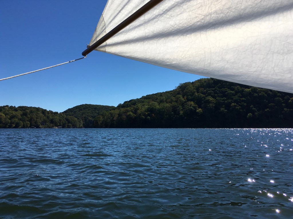 Then the sail whipped and snapped and we lost our momentum. We were pointed towards a bend in the lake where we don’t normally go, because there’s not usually wind enough for it. The boat tugged, tipped, took off for a second, and then stalled again.