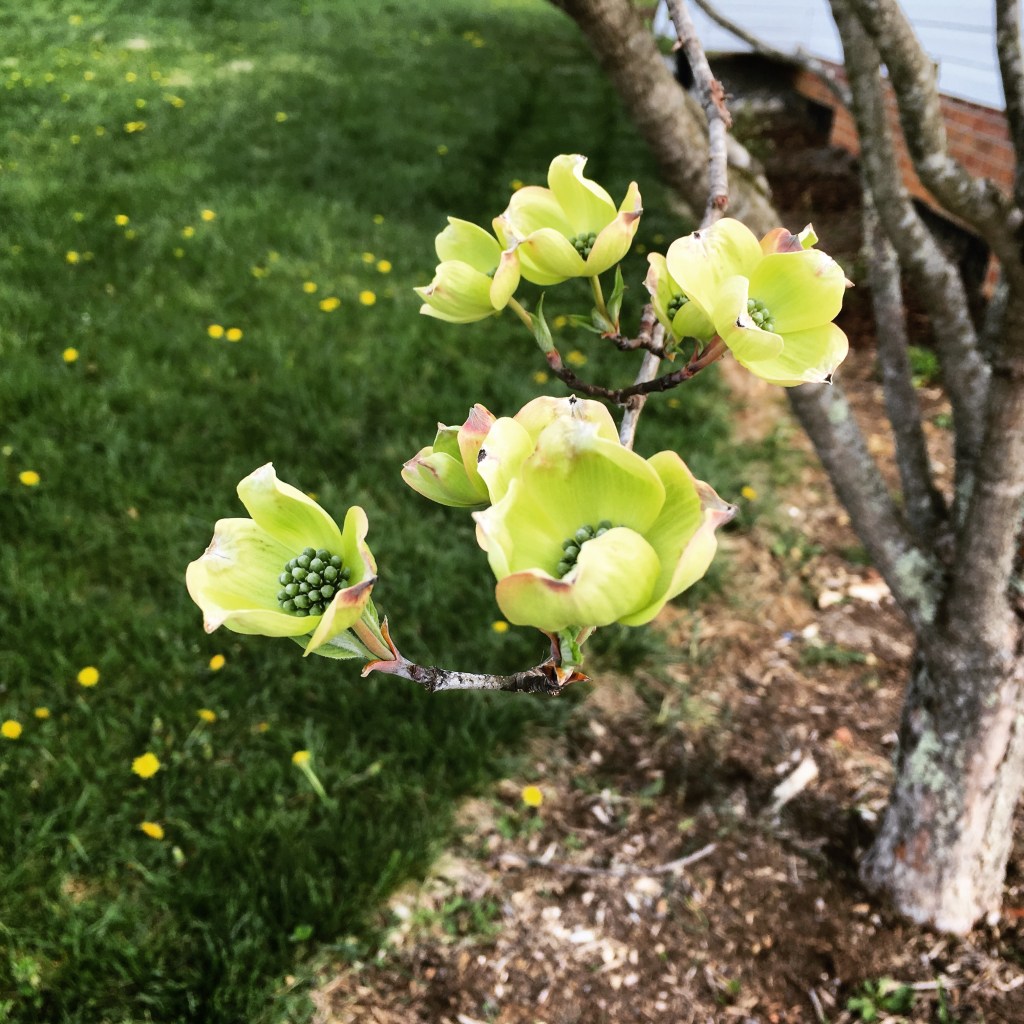 Droplets cling to the handles of the wheelbarrow, and I am enjoying my rest. I’ve spread mulch on all the beds, I’ve weeded, scattered seeds, watered, planted goldenrod and roses and columbine, transplanted bee balm and bottle brush, pruned forsythia, cleaned leaf litter out of the herbs, filled a vase with mint. My hands feel arthritic, but the garden is beautiful. The redbud blooms magenta, the rosemary has dainty lavender blossoms, our daughter’s columbine is crowned with purple and white flowers, and the roses pop a hot pink. Our neighbor’s dogwood flowers spread open in a spring green, the sky is storm grey, and thunder rumbles over the mountains.