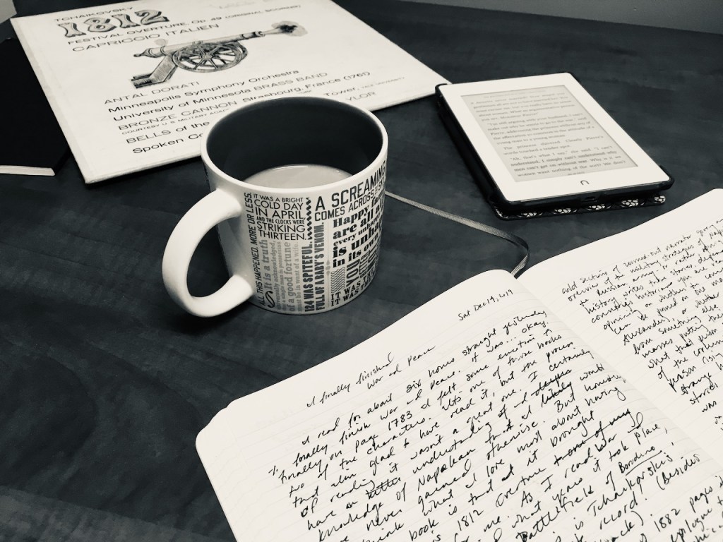 Like a runner in a marathon, I set rewards for myself along the way. “When I get to that mailbox I can walk for a minute and drink some water.” Only for me, it was “When I get to page 1382 I can drink vodka.” I bought a little bottle of Stolichnaya and made a White Russian when I was within 500 pages of the end. For my final day of reading, I changed into sweatpants and slippers, cranked up my space heater, made a cup of coffee in my new literary mug that was a gift from my friend, and I blared Tchaikovsky while I read through to the end.
