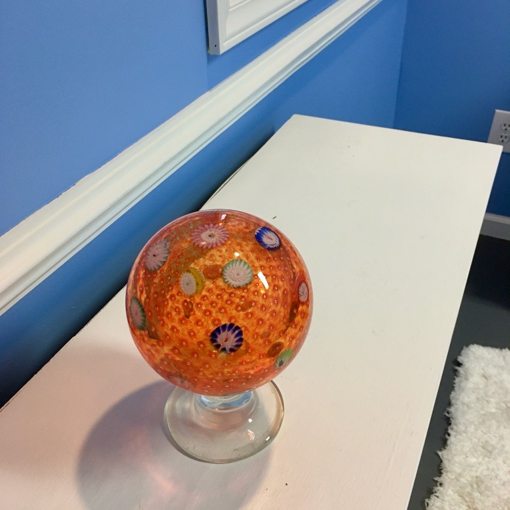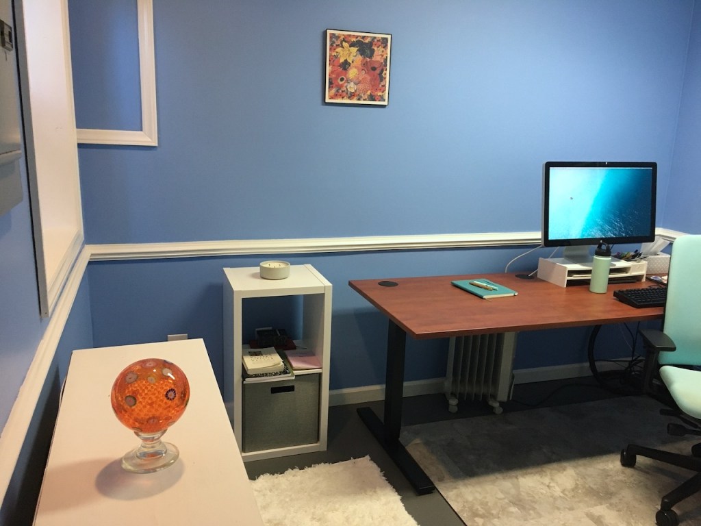 After rejoining Automattic, I wanted to make my office my home again. The monitor, desk, and chair I got from when I was hired in 2014 are still my sturdy constants, and I freshened the rest of the space by making some small changes. I paid our daughter to paint my bookshelf white, my husband made a chairmat out of plywood and vinyl tiles, and I bought a fluffy runner rug to soften up the place. Most exciting, with my new office color I can finally display the orange glass globe from my grandfather that I’ve carted around with me for 20 years but never had a good place to display it.