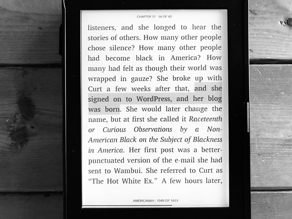 I just nerded out big time when I came across this line in Chimamanda Ngozi Adichie’s novel Americanah, where the main character writes a blog called Raceteenth or Curious Observations by a Non-American Black on the Subject of Blackness in America: