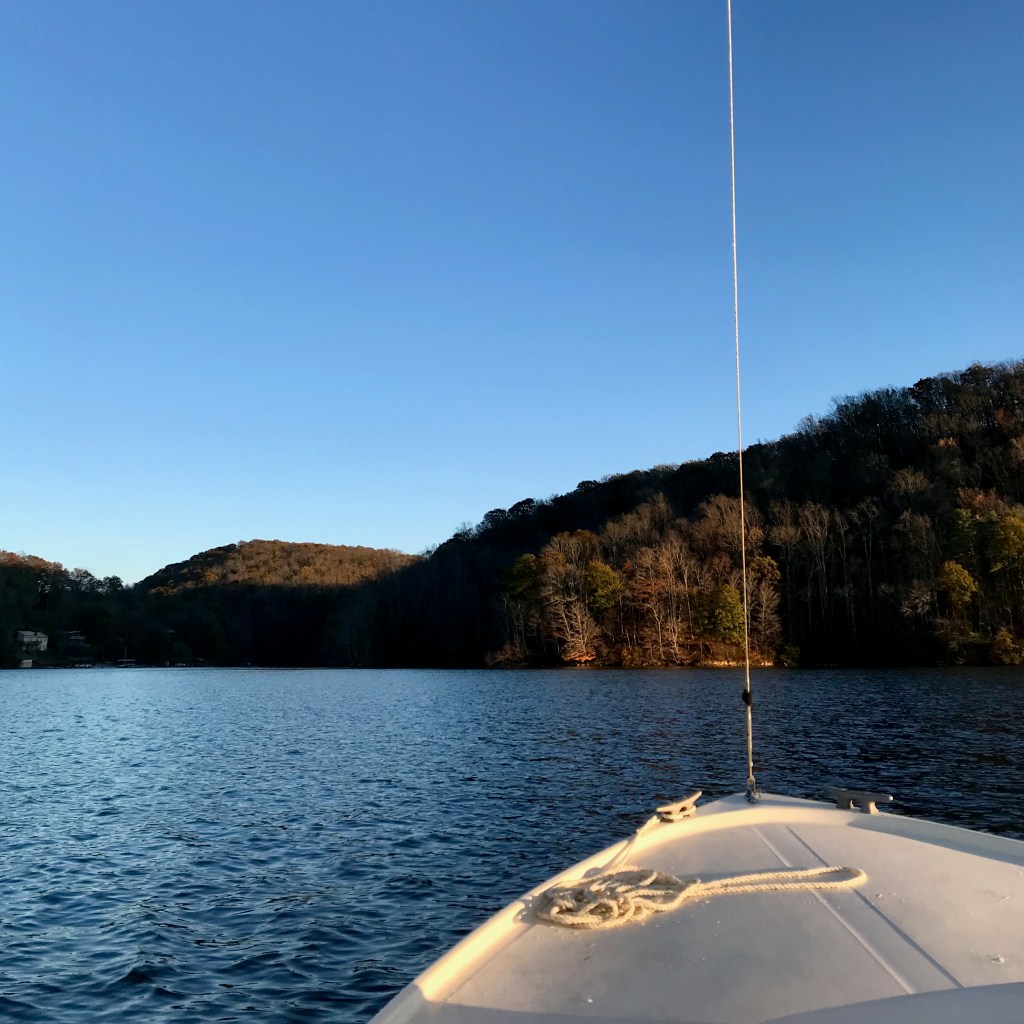 Recent wind stripped the trees of leaves, so most of the fall color is already done. The light itself was beautiful, though. We dropped the jib upwind of the ramp, and took one more trip back and forth across the lake as the sun dropped. Halfway across, I started shivering, and I didn’t stop until we were in the car with the heat on. I’m going to have to figure out a better glove situation for cool weather sailing; my hands are useless when they’re cold and numb. But look at the light!