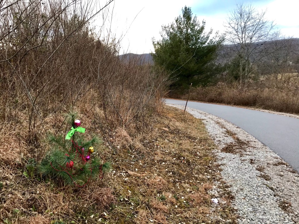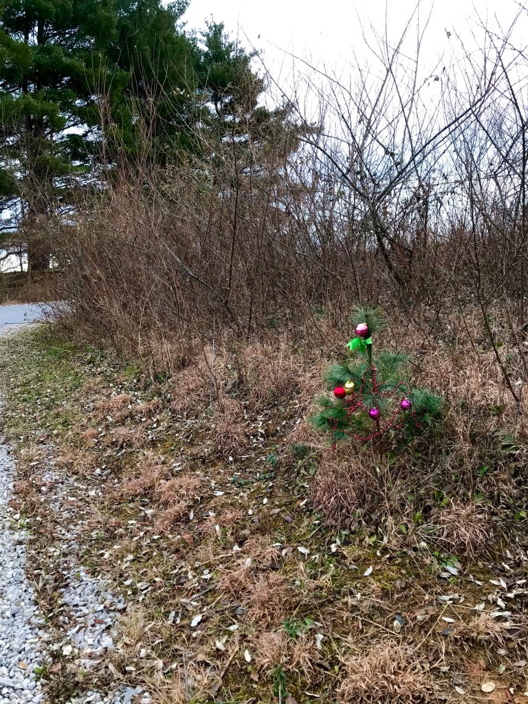 I took advantage of the warmish weather today and went for a mid-afternoon run. As I panted up a hill in a community nature park nearby, I saw this Charlie Brown Christmas tree all dressed up by the side of the path. It gave me a little jolt of joy. I love the thought of someone decorating this little tree, smiling to themselves as they think about all the others it will surprise into a smile.