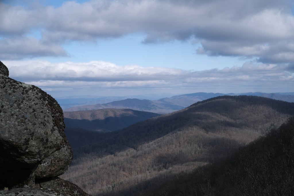 In the end, I got up. I looked out the window and saw the water in the bird bath was frozen. I pulled on running tights and wool socks under my hiking pants, and I layered on top with a long sleeved running shirt, a fleece, a hooded windbreaker, gloves, and a slouchy hat. We drove an hour to the Blue Ridge Parkway soon after sunrise, and we were only the second car in the Sharp Top Mountain lot. It’s a fairly popular hike, so we wanted to go before it got crowded.