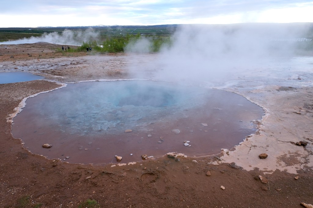 Between Strokkur’s ventings, we walked around to see more pools, including the beautiful blue of these deep pools. The color was hard to pick up in the low light, but it was gorgeous.