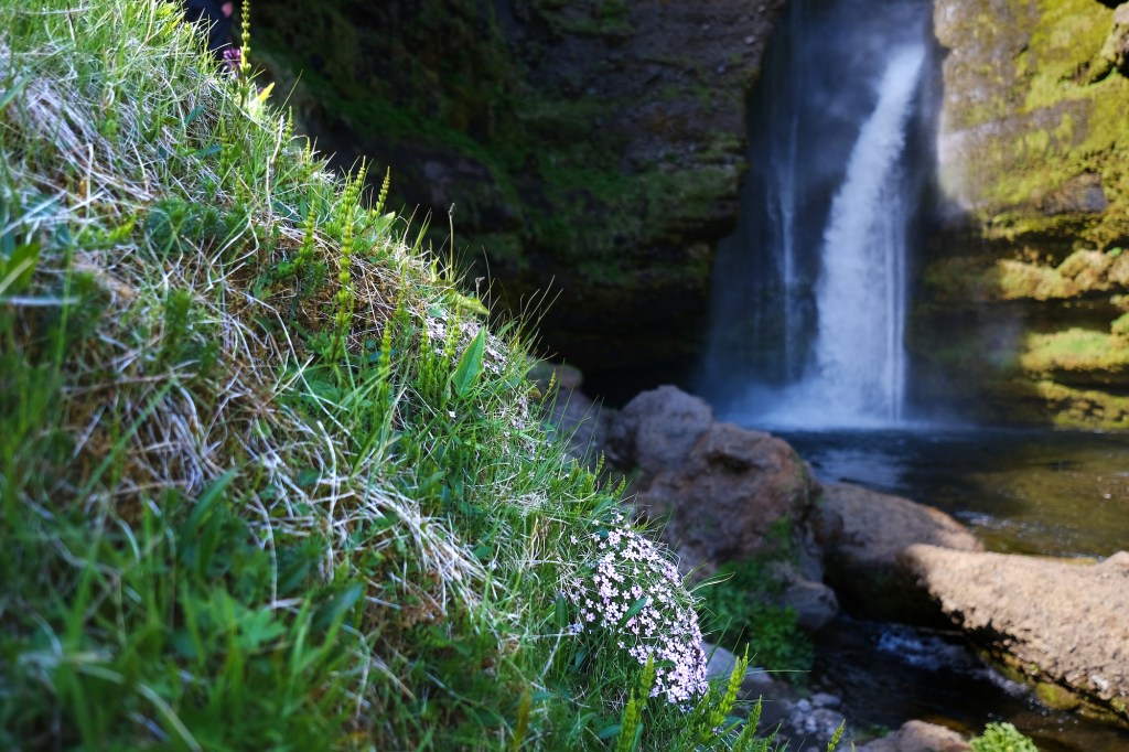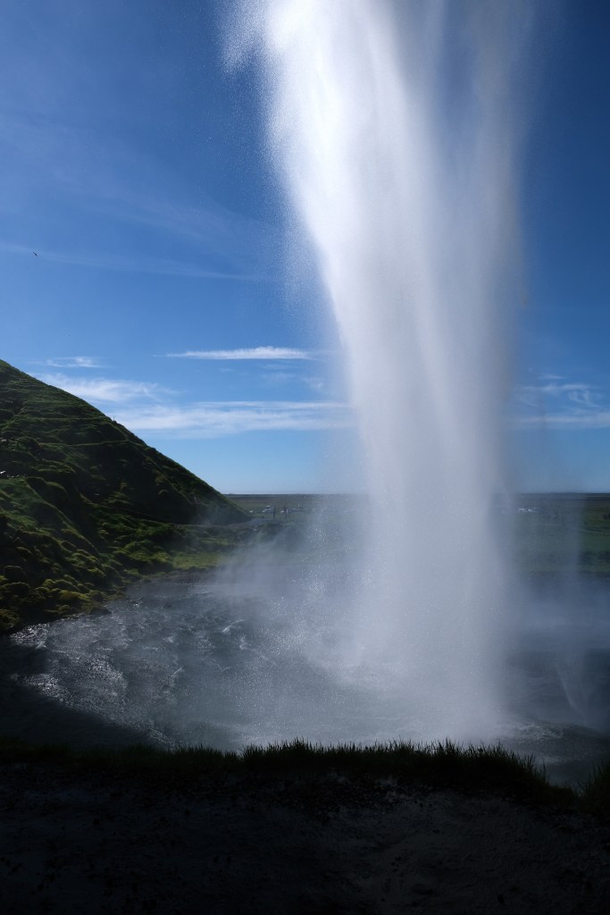 Just beyond those, another 1-2 minutes along the path, is a hidden fall, Gljufrabui, that drops through a hollow in the rock. Its name means “gorge dweller,” and the fall is tucked away behind a curtain of rock. To see the water drop, you hop along wet stones (or wade) through a stream under an arch in the hillside, which takes you into a hollowed out column full of spray and the thunder of splash. Inside, you can look up 40 meters (130 feet) to see sky through the hole in the mountainside and watch the water cascade down into the mossy cave. It was super wet in there and I didn’t get any pictures because my lens instantly misted up, but this site has some pretty cool photos.