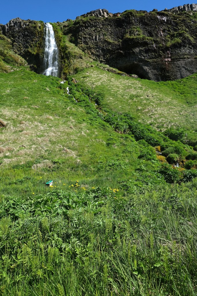 Within a 1 minute walk of the big fall, which dropped about 60 meters (200 feet), were three smaller waterfalls, lush green grass, and happy yellow flowers.