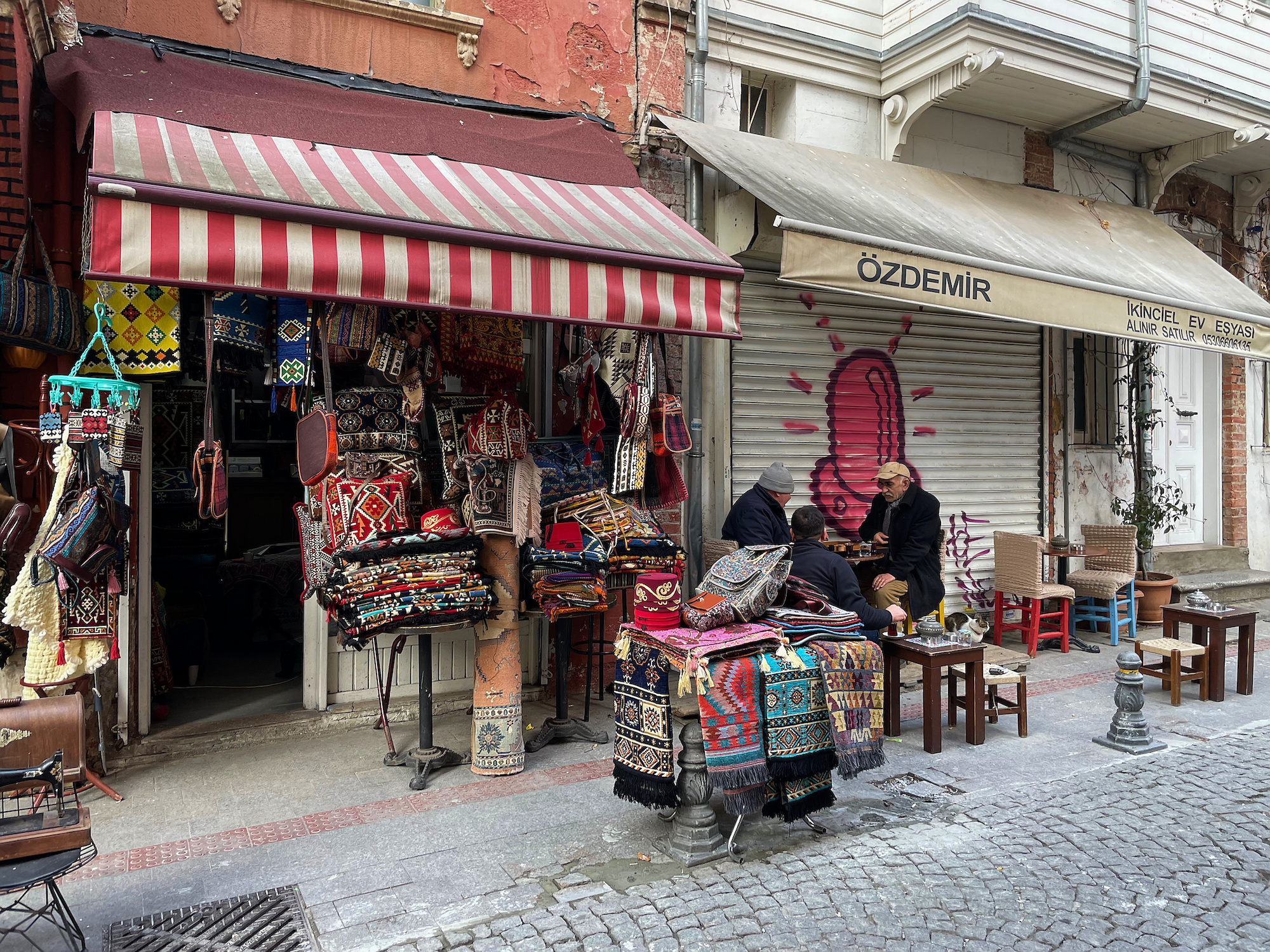 Mosaic and tile at Istanbul Archaeology MuseumDoor to tile building at Istanbul Archaeology MuseumTurkish tea setsAt the Grand BazaarLamp shop at the Grand BazaarCat 7 of 492Turkish DelightAt the Grand BazaarTurkish Breakfast, first courseLeaving Europe to go to AsiaLeaving the Europe side, about to cross the Bosphorous. Our Airbnb was near the tower on the left (Galata Tower).Our team walked an hour on the Asia side of Istanbul to find this cat statue.In the antique districtSidewalk backgammonAt the ferry dock on the Europe sideGraffiti at the pier; we walked by this wall each time we crossed the Golden Horn (an inlet of the Bosphorous River) to get to the Grand Bazaar and mosquesKitty outside my favorite coffee shopBooks and Coffee. I liked their coffee best.The view from our Airbnb: the Golden Horn waterway, Hagia Sofia mosque (maybe? maybe not — there were many mosques), and our resident seagull who squawked at us all day while we worked.