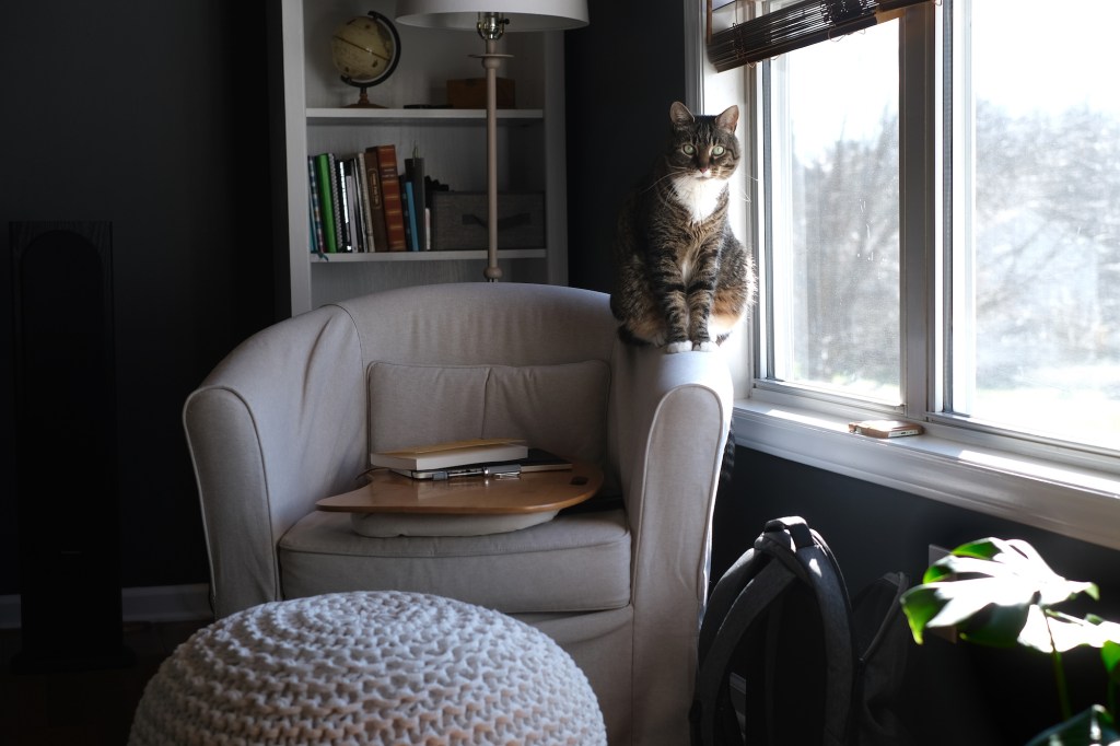 Meanwhile, my husband and I knew the new chair had to go. The only people who sat in it were the cats. When they’d stretch and finally thud down to the floor to saunter over to their food bowls, they left behind mats of fur that grossed us out. I’d clean the chair and sit out of obligation since we bought it and it was in the best spot in the room. But I didn’t like it. I certainly didn’t get cozy and write in it.
