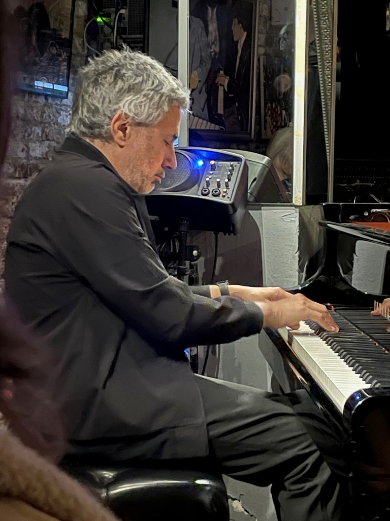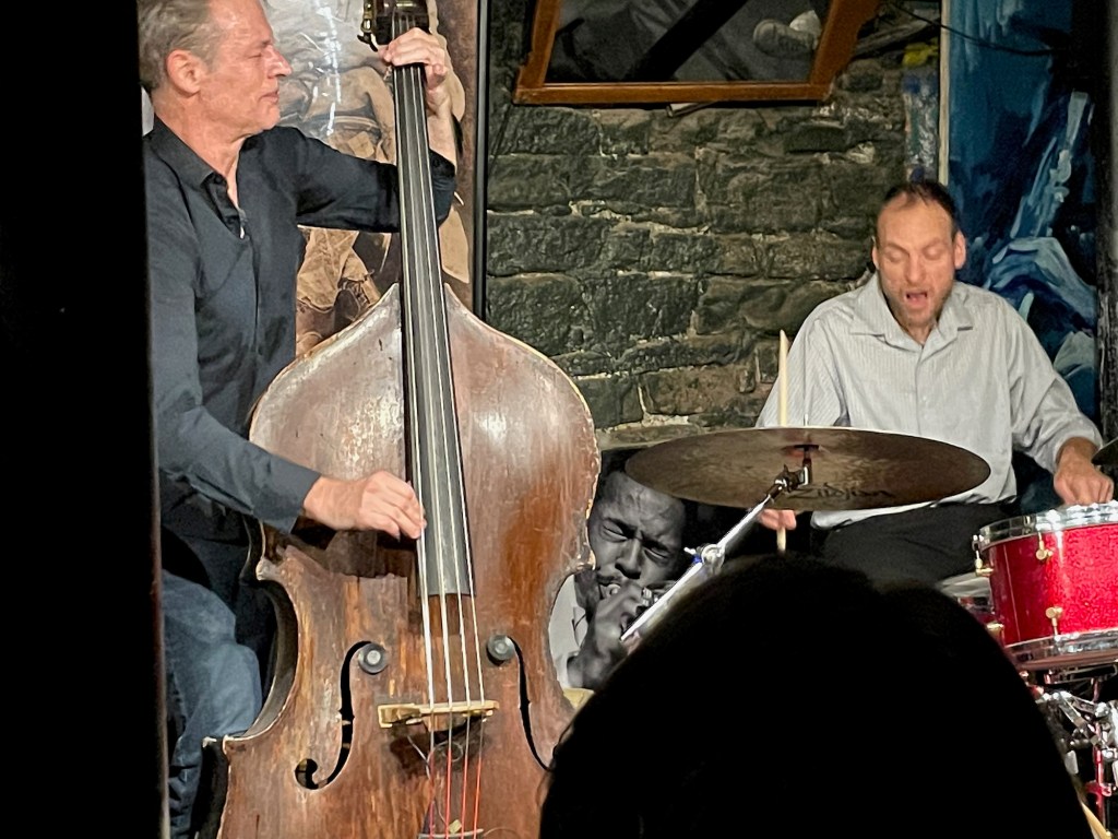 Saturday night, we went to a different kind of jazz club. Where Blue Note was bumping, and everyone on their feet at the end, and the music high energy and loud the night we went, and the club is at street level and has windows and tables and seats 200, the place we went Saturday night, Smalls, is a tiny basement jazz club with seating capacity for 74. We had tickets for a 7:30 set with the Jean-Michel Pilc trio, with Jean-Michel on piano, Ari Hoenig on drums, and François Moutin on the upright bass. We stood outside an unobtrusive, beat up door with a beat up sax above it and a tiny awning that said “smalls” as we waited to go in, and when the door did open, we walked down a set of stairs into a small room with maybe 6 rows of 10 metal folding chairs. We sat close to the piano, ordered martinis before the set, and listened to the hum of everyone talking. The drummer was there tuning his kit when we sat down around 7, and the bassist and pianist showed up about 5-10 minutes before the set began. At 7:30, Pilc was smiling at what I assume was one of his friends in the corner, put his finger to his lips and quietly said “Sh, sh, sh,” and the room went silent.