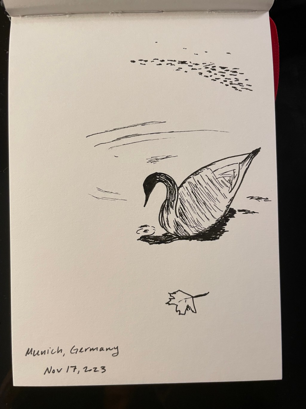 As soon as I got back to my hotel room, I sat down and drew. I drew the Glockenspiel. The next day, I drew my coffee cup and cakes from the cake shop. The third day I drew a Munich surfer, the fourth a swan on the lake I walked every morning, the fifth a leaf with raindrops on it. On the 10 hour flight home, I picked up doodling, and I spent hours just drawing lines and shapes. The plane was frigid as we flew over the Atlantic, so I plugged in the headphones and turned on the crackling fireplace relaxation video they had on the in-flight entertainment. I’d read for a little while, then pull out my sketchpad and doodle to the snap and pop of a video fire, then read some more.