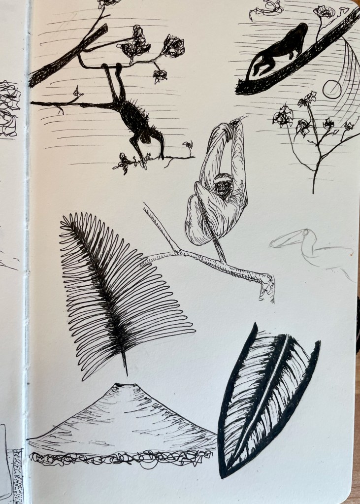 The hike started pleasantly in terms of temperature — we expected to be sweating buckets, but in the shade of the green forest, the temperature was surprisingly tolerable. As the minutes ticked on, though, and my backpack smothered my back, I became slick with sweat. We went in the afternoon, maybe around 2pm, and we walked slowly to look for sloths. The sun sets at 6pm, and by 4, the light was getting low. Mosquitos began to emerge, and I soon was covered in bug bites and was ready to come home. Our stomachs were growling, too. So after seeing the first little sloth, then near the end of the loop seeing a message drawn in the dirt of the path, “SLOTH look up,” and looking up to see a big sloth, then going back to see the little sloth again, we hiked out.