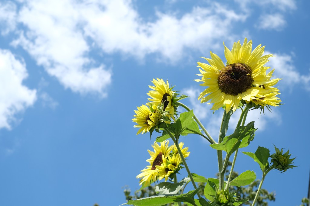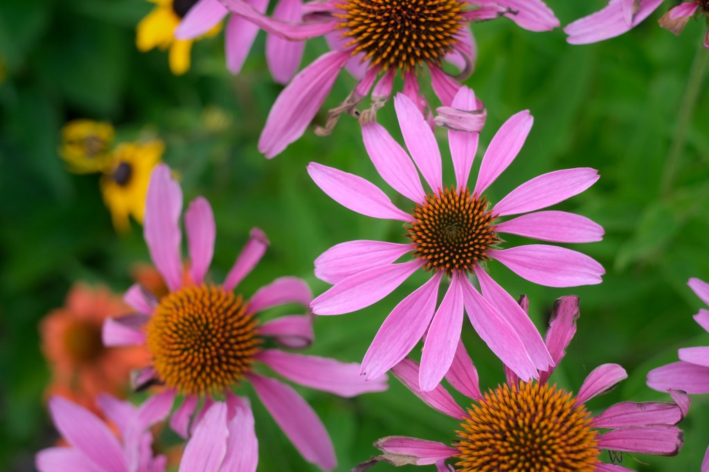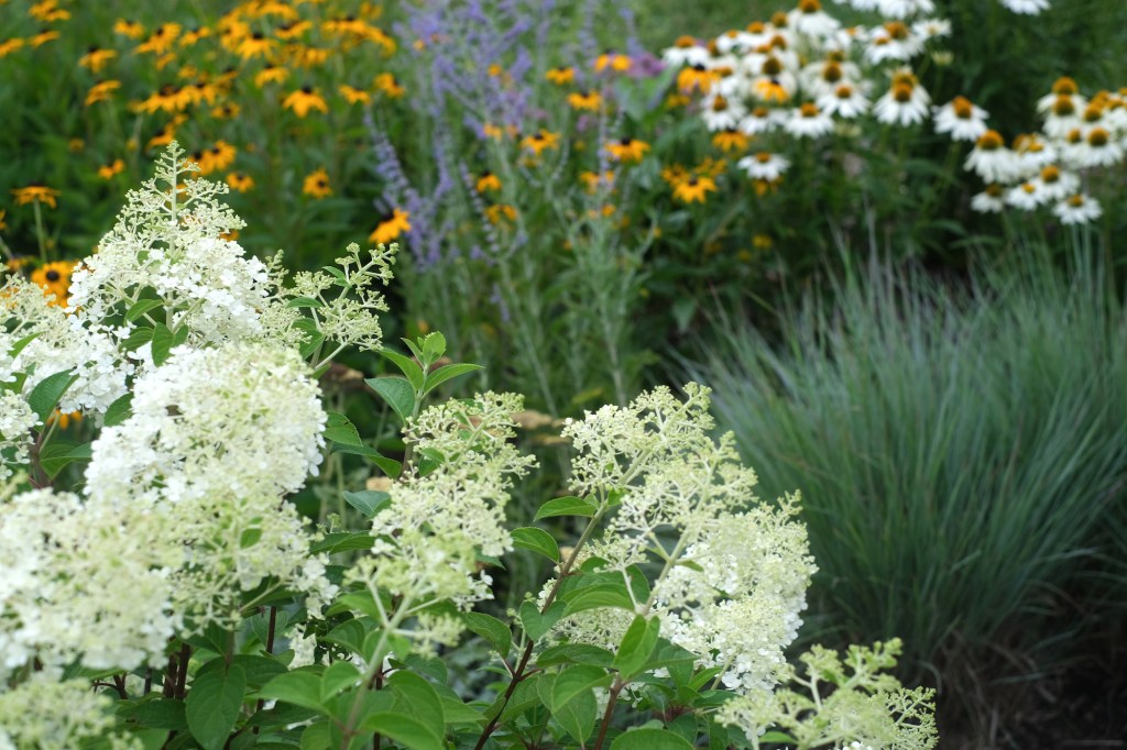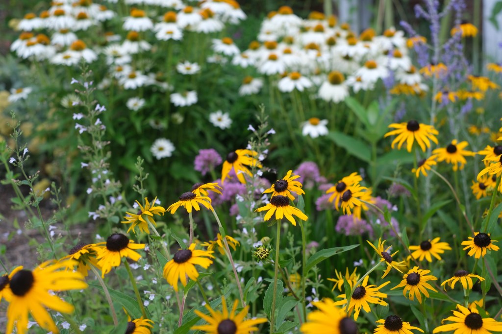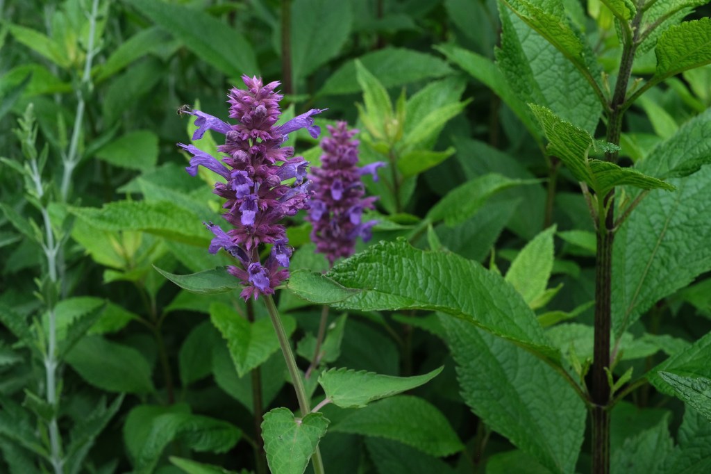 I arranged and rearranged the still-potted purple asters and deep red chrysanthemums I’d bought in the rain on Saturday. I couldn’t figure out where I wanted them. I placed the potted mounds in the flower bed, then walked out to the street to see how they looked, moved them, walked out to the street again, and decided I needed to cut back and tear out a bunch of other stuff to make it work. I moved yarrows from front to back, salvias from left to right, agastaches and lantanas, verbenas and veronicas from right to left, then watered them all in under low, looks-like-rain clouds. I moved yard waste and an old rotting chair to the curb.