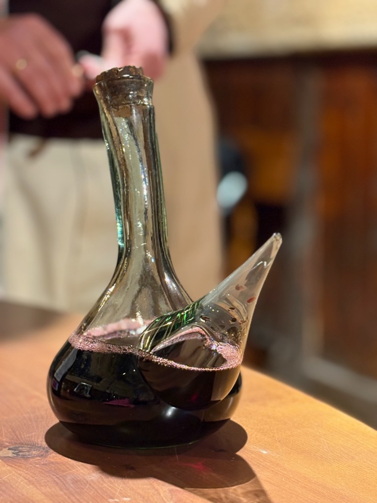 Raúl had stuffed our pockets with bottles of wine from his own house, and I carried his porron in my backpack. Once we were underground and his friend had shown us around his bodega, Raúl pulled out a bottle, filled a porron, and he and his friend demonstrated how to drink out of it. You pour the wine in an arc into your mouth without touching the spout. It is not as easy as it would seem to do this without pouring wine in your nose or dribbling it all over your clothes. Luckily I wore black. I asked why this way? As soon as I said it, I realized, ahh! When done correctly, nobody’s mouth touches the porron. This makes for easy cleanup: no wine glasses to wash.