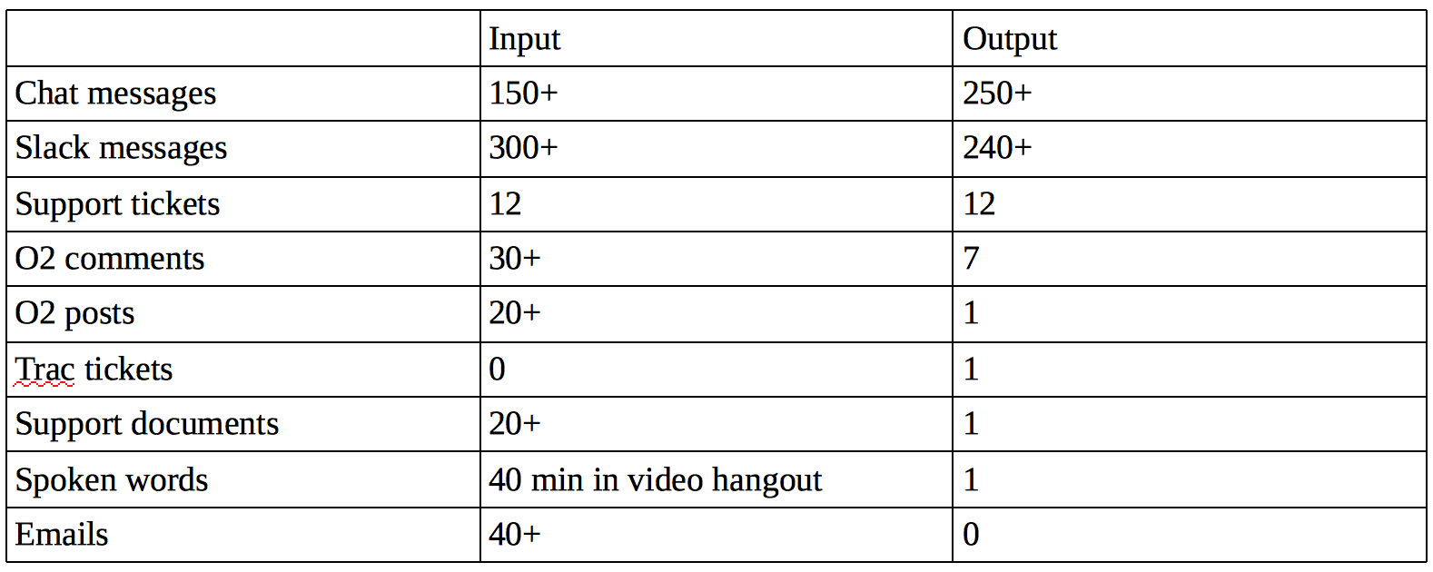 My email inbox does not include emails from real people who I need to respond to — all of the communication I do with co-workers is via internal blogs and a messaging tool called Slack. Instead, I use email to triage WordPress notifications for communications that happen via our internal blogs, or P2s. In my inbox were a few mentions from meetings and conversations I was involved in (delete), several posts about various products, teams, and business and marketing updates (save for later), and discussion threads I’m following about live chat tips, help desk tools, and product flows (skim then delete).