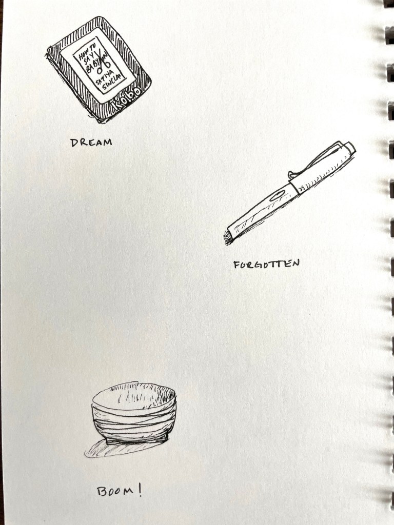 I still have garden stuff to do, but I’m gardened out for now. The fertilizer and new plants will have to wait for another weekend. With my two remaining days before going back to work, I want to return to my sketch journals. After completing my four week 10-minutes-per-day drawing challenge, I discovered that, surprise! I enjoy drawing as a method of journaling. I don’t complete an entry every day, but I do manage 2-3 journal pages per week. I enjoy the process of drawing little doo-dads from my days, and unlike my written journals, I actually go back and look at my drawn journal pages. I enjoy the little delights I’d forgotten about.