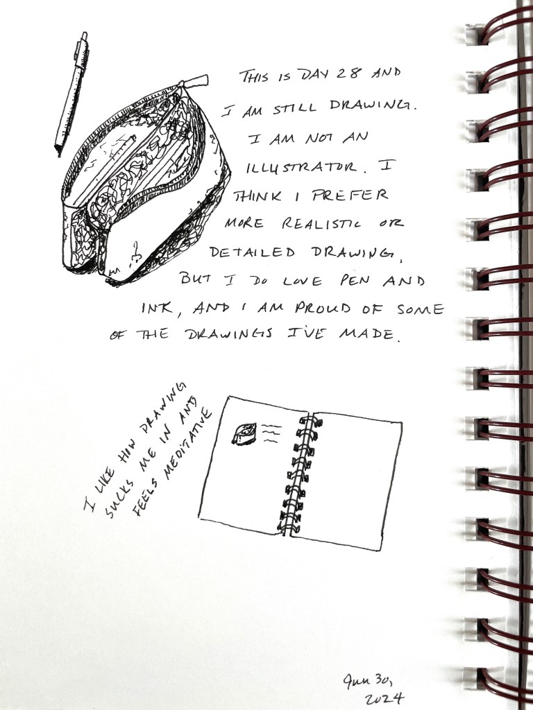 The final weeks of the 30 days of drawing challenge included several assignments I wasn’t crazy about, all of which included drawing human figures. On those days, I grudgingly did the exercises, but I derived no joy from them and have therefore not included them in this post.