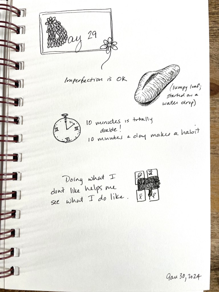 This was good for me to learn: it helped me figure out what does bring me joy in drawing. I loved the lettering exercise, and I loved one of the visual storytelling assignments: we drew three random objects, then pulled words out of a bowl to go with the drawings to tell one-word stories that were actually kind of profound. For example, I drew a fountain pen, and the word I pulled for that one was Forgotten. I’ve not been writing much lately (because I’ve been drawing), and that one was eye-opening. I also found I love drawing small objects like my ink bottles, my pen pouch, and an imperfect baguette.