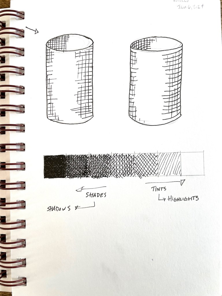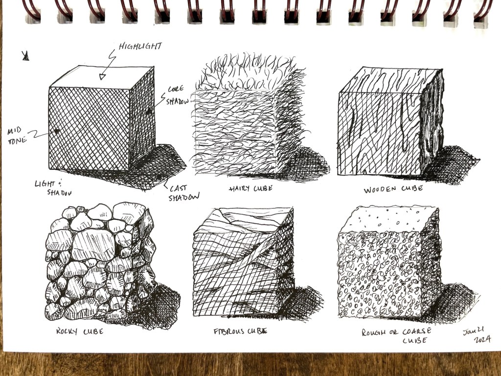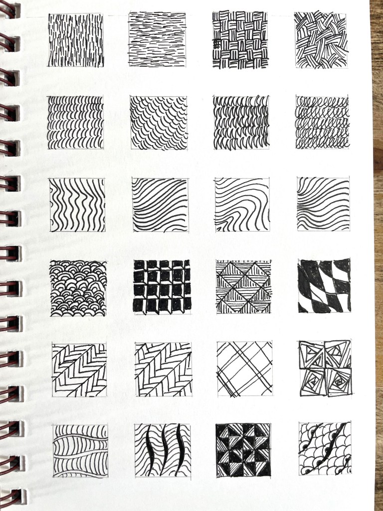 Drawing is still very new to me, so everything could and likely will change. On the days of assignments I didn’t like, the ones that involved drawing people, I was interested by what I chose to do instead to scratch my drawing itch. On those days, I found joy in simple drills of learning how to shade and make textures and patterns using pen and ink.
