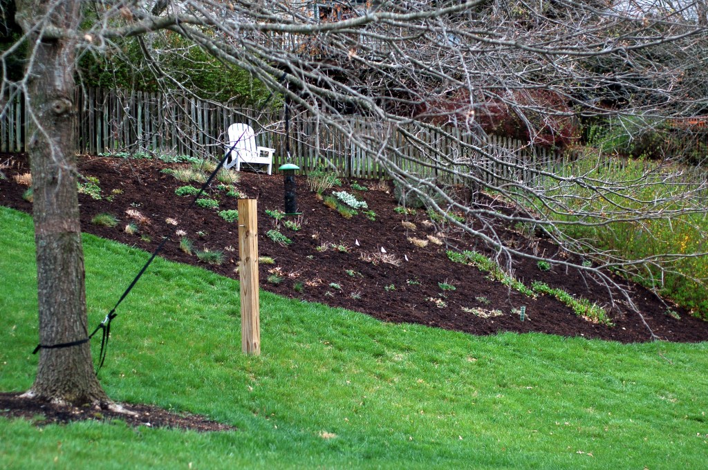 Rhododendrons in bloomLeftmost bed: grasses, agastaches, bee balm, rue, Joe Pye weed, nepeta, black eyed Susans, lollipop vervain Middle bed: wind dancer grass, echinacea, sedum, marjoram, scabiosa, indigo salvia Right bed: rue, Mexican feather grass, lamb’s ears, pink veronica, mums, Shasta daisies, blue gramma grass, little bluestem grass, milkweed, goldenrod, bee balmRain on sedumsSpicebush in bloomMy throne at the top of the hillHosta emerging; I caught it before the deer eat itBack bed and hammock treeBirdseed and rosemaryLate afternoon from the top of the hill