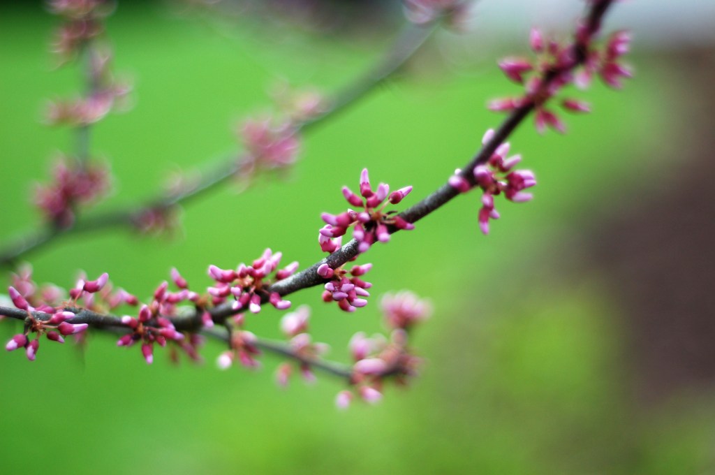 Rose and redbud bed (and herbs, lilac, silvery blue wormwoods, and artemesia)Dogwood budDogwood, butterfly bush, yarrow, and lavender already visible; butterfly attractors of milkweed, gallardia, salvia, liatris, and agastache, plus the delicious smelling lemon balm will come laterHostas emerging under the dogwood; lavender and dianthus at the foot of my chair; Karl Foerster grass shorn for new growth in right of frameThe bed in front of the stairs is a prairie type bed, with switchgrass, prairie dropseed grass, little bluestem grass, black eyed Susans, white coneflowers, liatris, sage, New England asters, calamint, Russian sage, and nepeta (catmint with blue flowers)