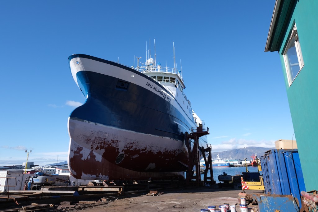 Most of the boats we saw are for fishing and whale watching. The boat in that final photo, the one we watched painters on scaffolding roll red paint on, has as much boat below the waterline as above. It’s massive and weird. We learned in the maritime museum that it’s a fishing boat with massive holds for the catch. The Arctic Ocean is just north of here, and given the wind we felt on our first day, I can’t imagine how wild and cold these seas must be. No thank you.