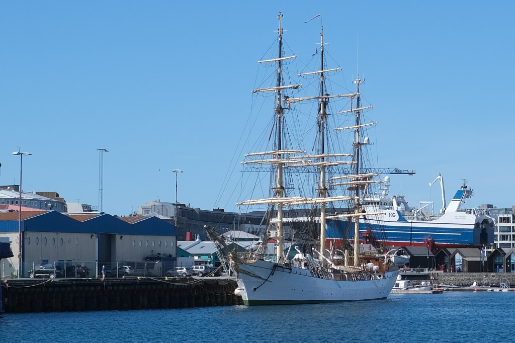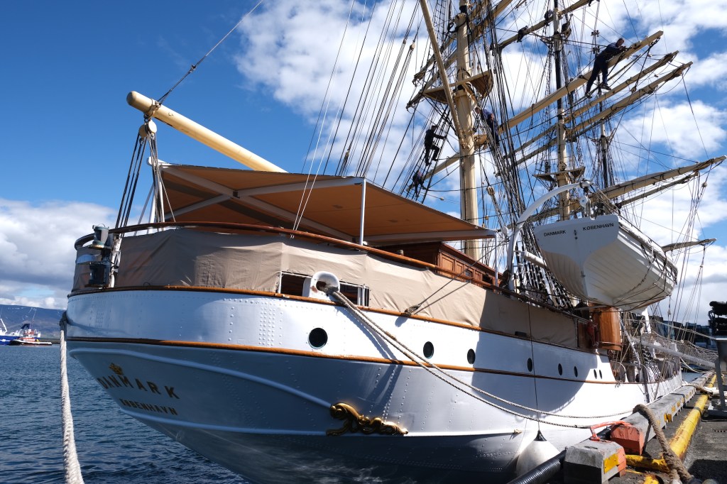 The Danmark tall ship is docked in Reykjavik, and sailors were up in the rigging when we walked by.