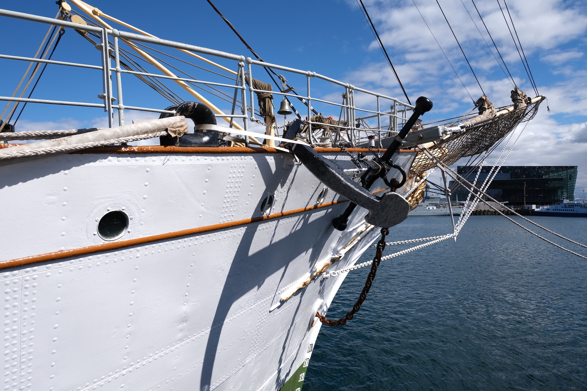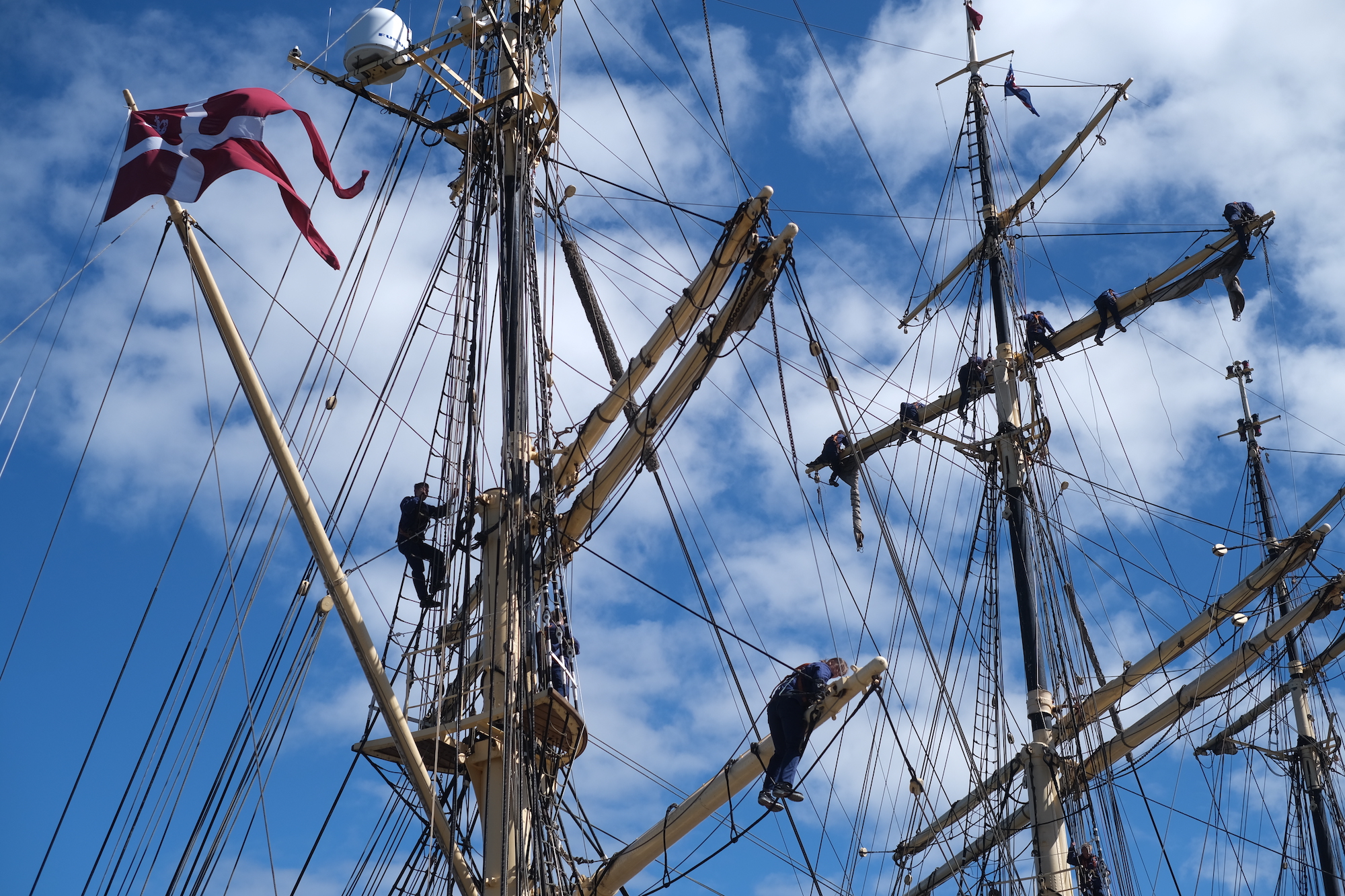 The Danmark tall ship is docked in Reykjavik, and sailors were up in the rigging when we walked by.