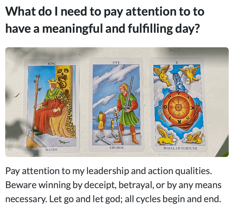 Single card Sometimes three cards are too much to digest, or I find myself not really paying attention to what I think about them and instead just regurgitate what the guidebooks say. In those periods, I’ll pull one card for the day with the sole intent of learning that one card — I’m not even necessarily asking a question about the day. I’ll put the card next to my laptop and look at it closely while I describe it in my journal. I’ll describe the colors, the facial expressions and body language, and the overall feeling it gives me. Then I’ll write what I think it is saying as a piece of art. Throughout the day or at the end, I’ll jot down moments that felt like the energy of the card.