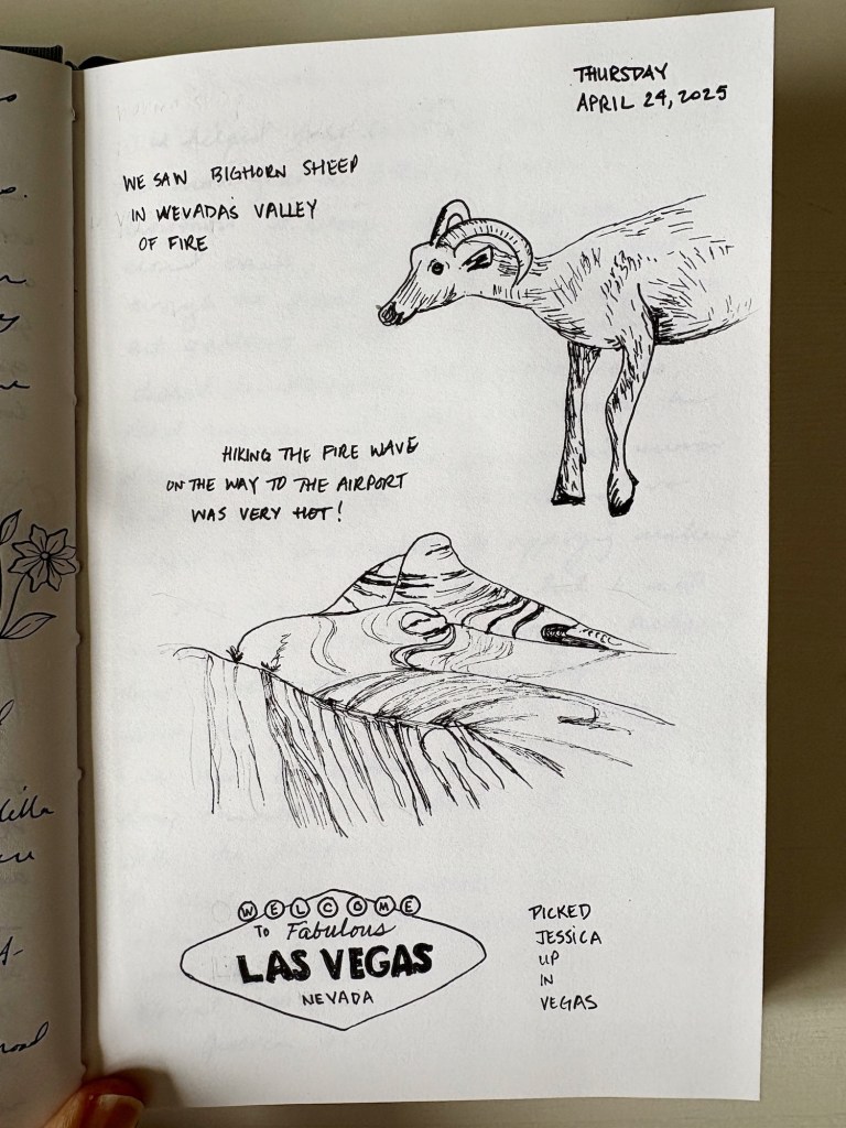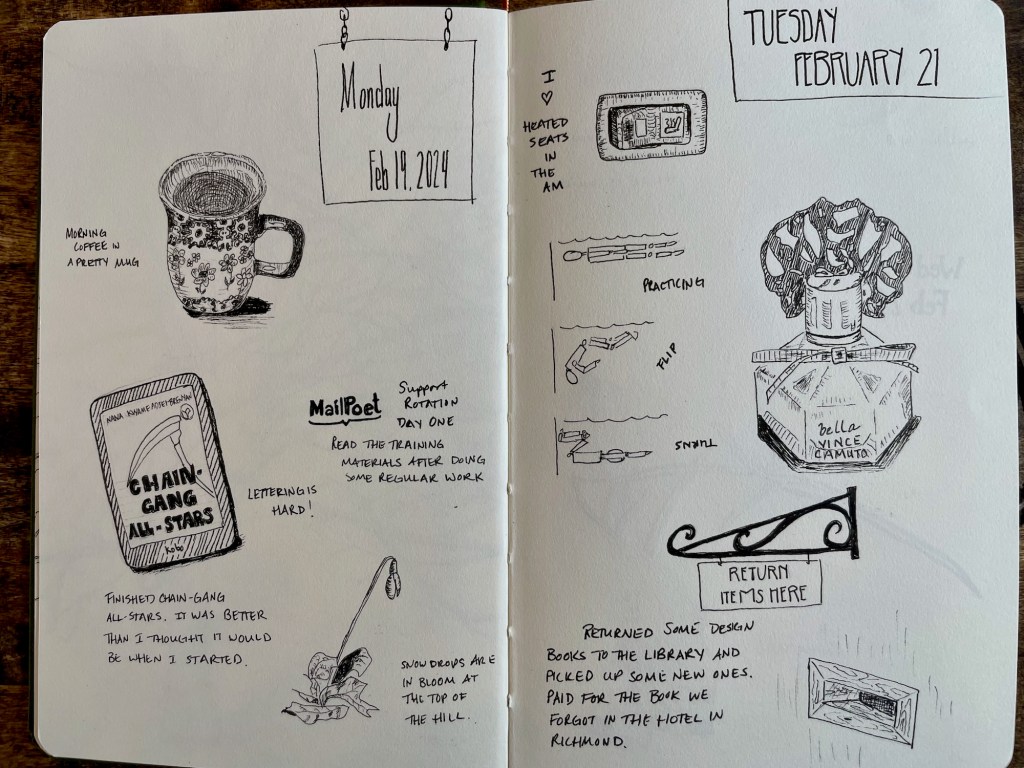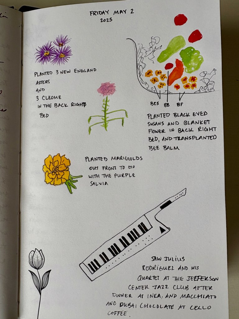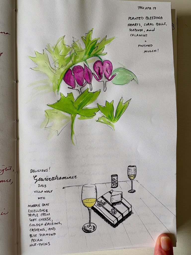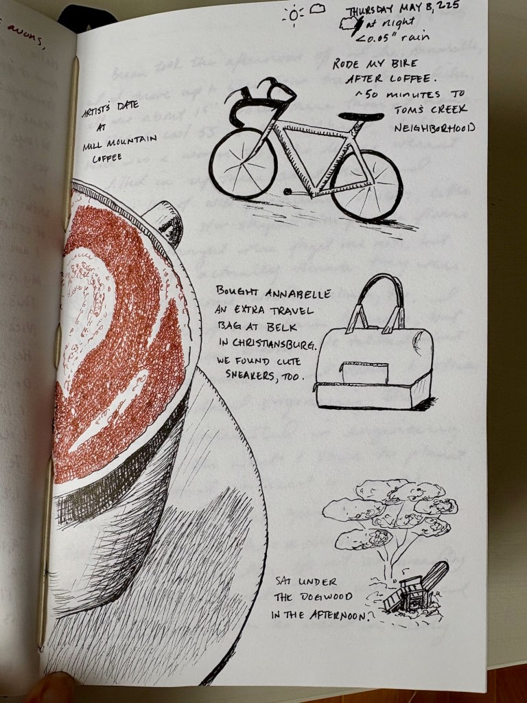 I still have garden stuff to do, but I’m gardened out for now. The fertilizer and new plants will have to wait for another weekend. With my two remaining days before going back to work, I want to return to my sketch journals. After completing my four week 10-minutes-per-day drawing challenge, I discovered that, surprise! I enjoy drawing as a method of journaling. I don’t complete an entry every day, but I do manage 2-3 journal pages per week. I enjoy the process of drawing little doo-dads from my days, and unlike my written journals, I actually go back and look at my drawn journal pages. I enjoy the little delights I’d forgotten about.