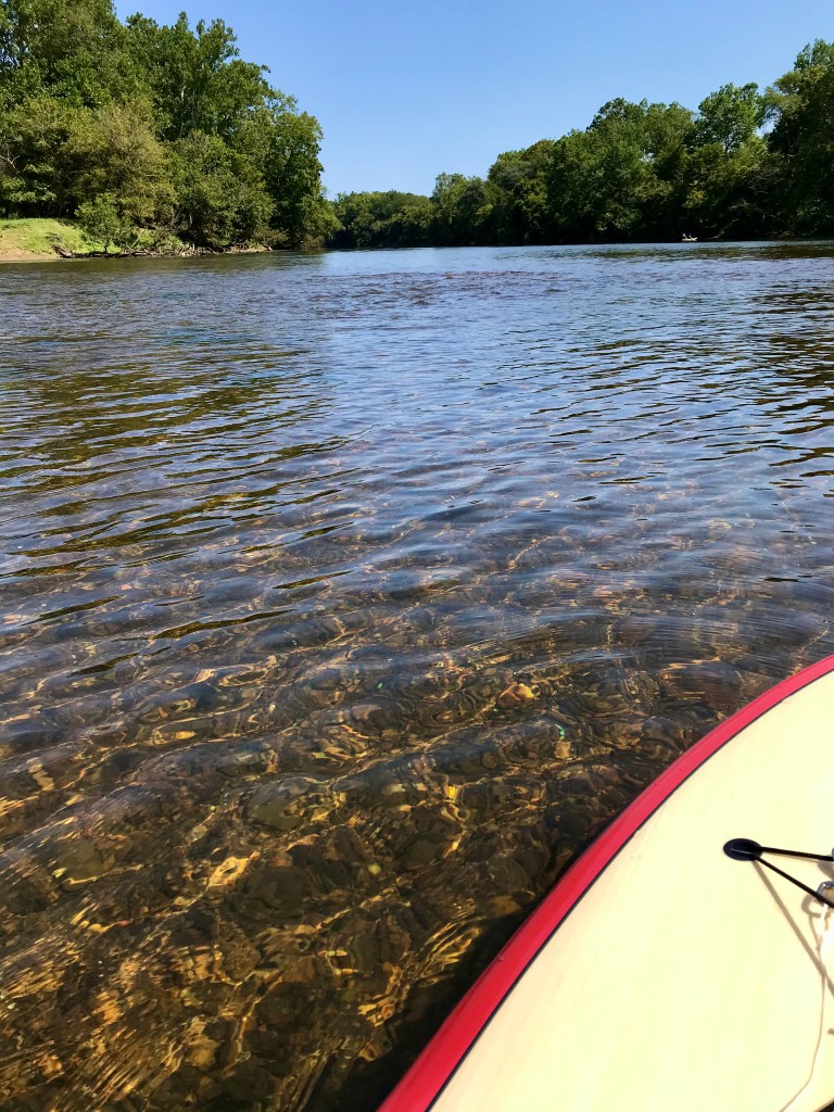 I loved it. When we paddled upstream, the sun was behind my right shoulder, and when I looked into the water on my left, the sunlight streamed in golden rays into the topaz depths. Sometimes the rays converged at my crown’s shadow, as if my shadow self were radiating sunlight from beneath the river’s surface.