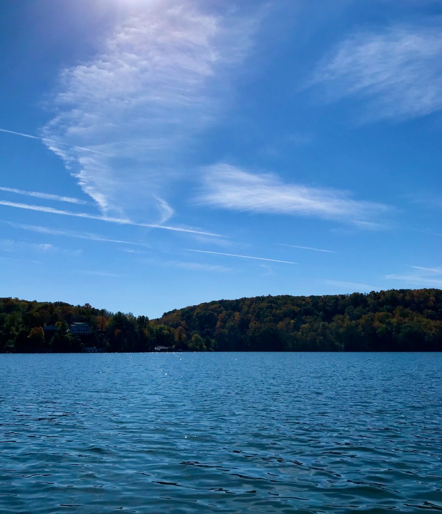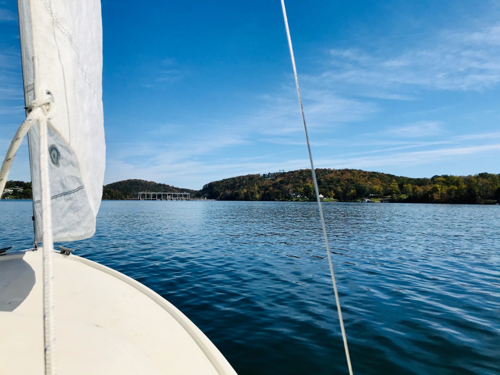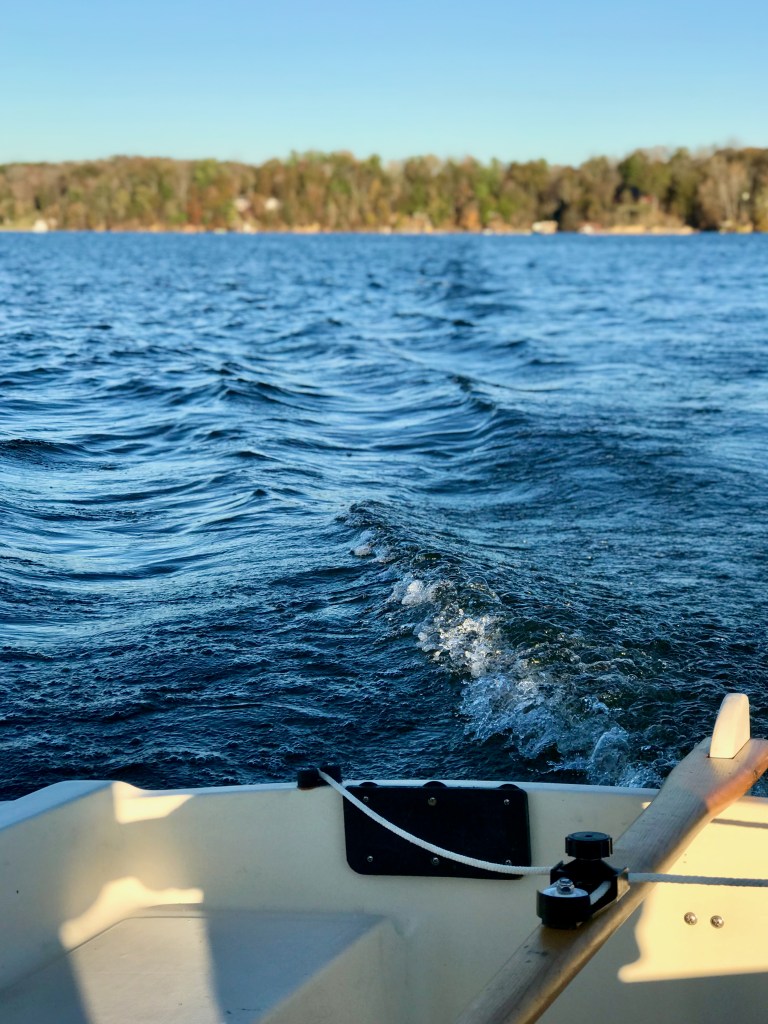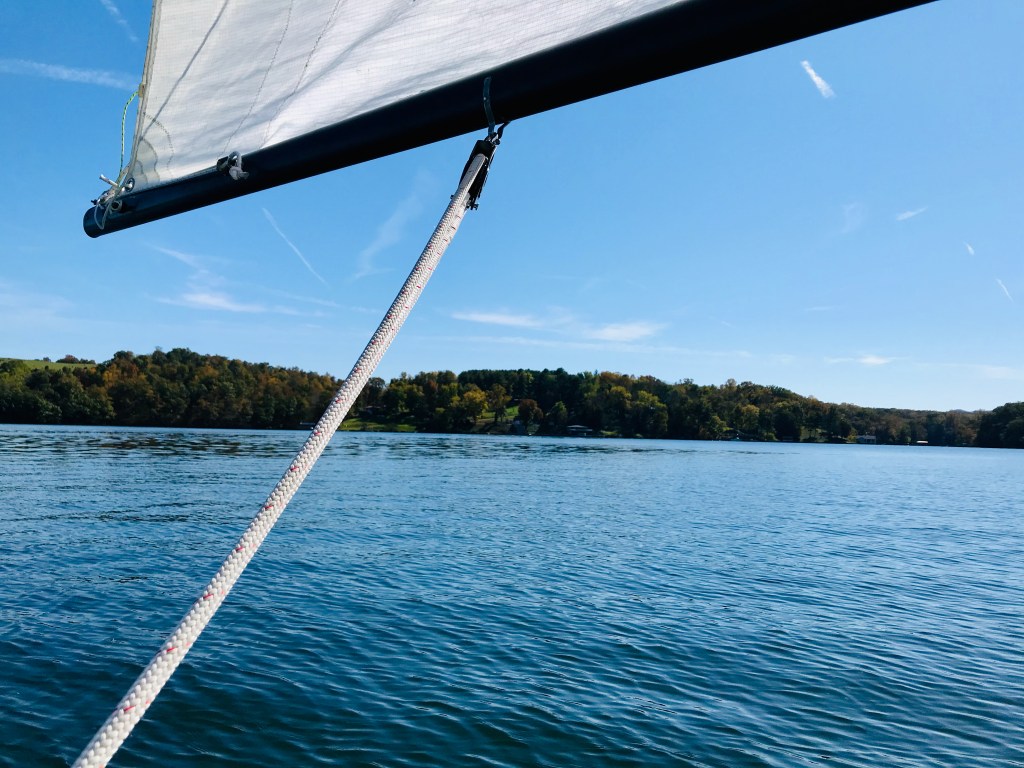The sail was glorious. The wind was the perfect strength to move our little boat near her top speed, and we sailed every point of sail. We ran with the wind behind us, where the water gurgles and and makes pliant sounds because we’re moving with it. We beat into the wind, where the water slaps and makes hard smacking sounds because we’re moving against it. And we sailed back and forth across the lake on a reach, the fastest point of sail, where the water makes fast rattling sounds, where the wind blew my hair from my face, and where we moved so fast we made our own little wake while under sail.