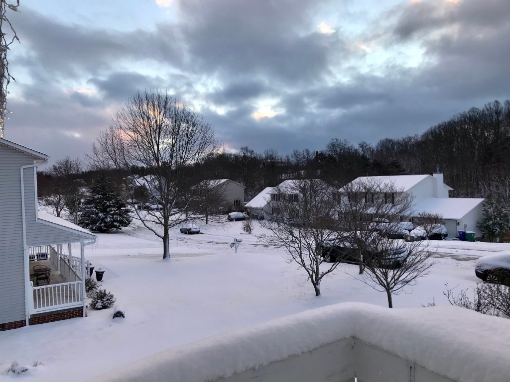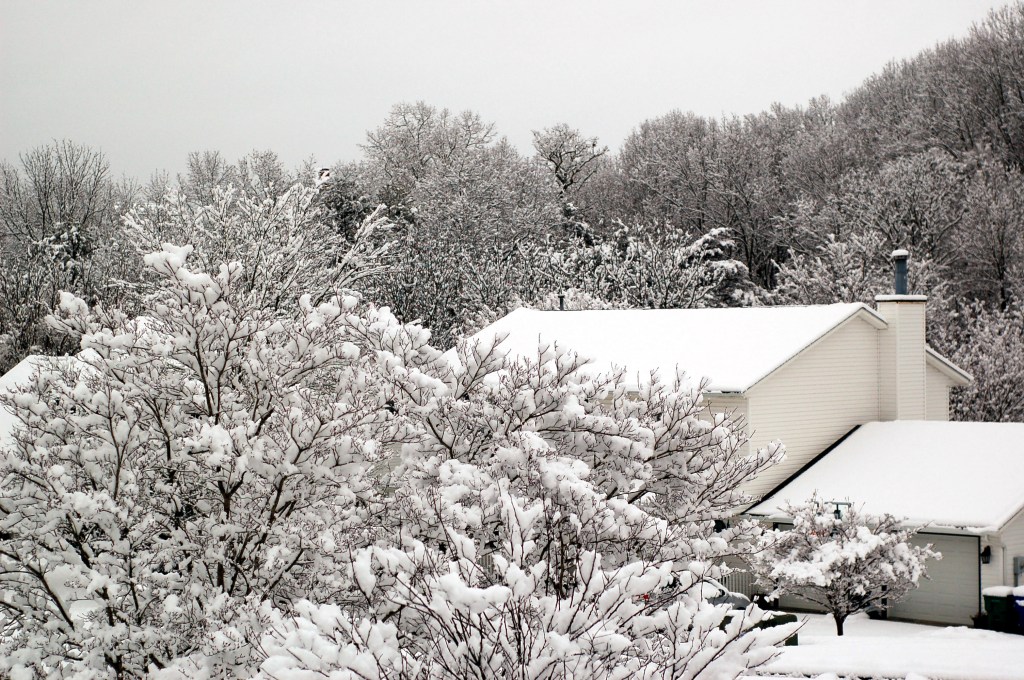 An hour later, when I emerged from the basement and looked into the darkness again, I still saw no sign of snowflakes. I made coffee and sat at the table to write. When I finally looked up, after the sun had risen, the soft morning light showed the back garden under 2 inches of fluffy white. Fast-falling snow filled the air, so thick it would cover me in a second if I walked out in it. It stuck to the trees and bushes and porch railings, transforming the world as it painted a magical winter scene before my eyes. I leaned back in my chair and watched it rush down.