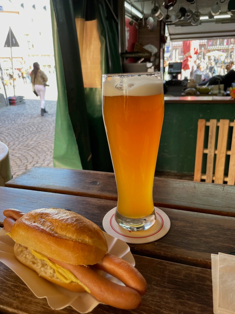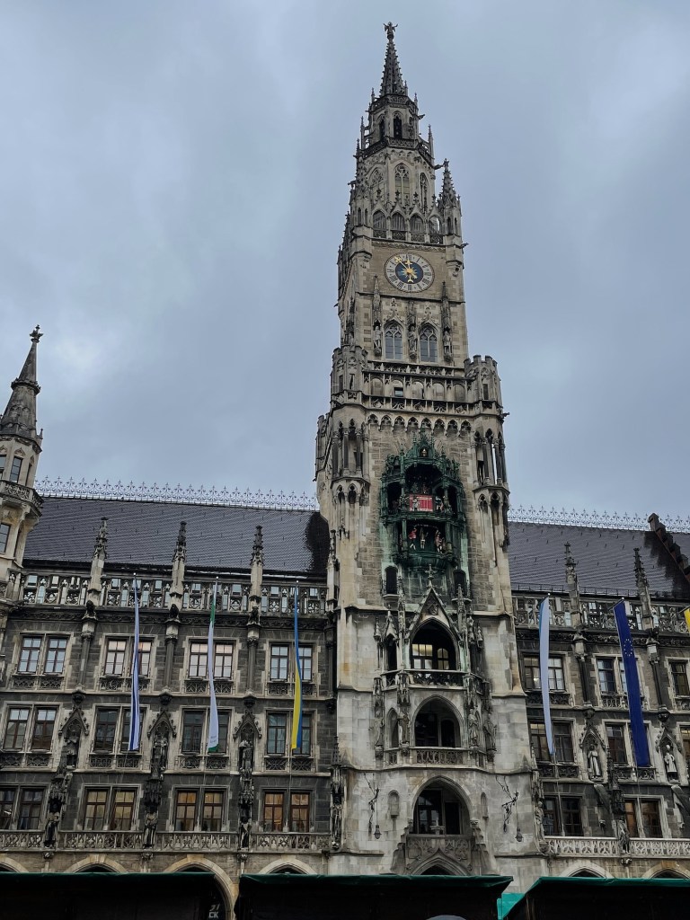 This day was our day off between meetups, and after breakfast, the four of us from my team who’d come over from Mallorca walked all around the city center to watch the Glockenspiel strike noon, to shop for art supplies, kitchen supplies, and a photography backpack, and to eat pretzels and drink beer.
