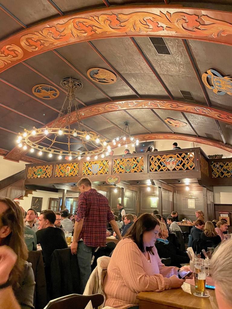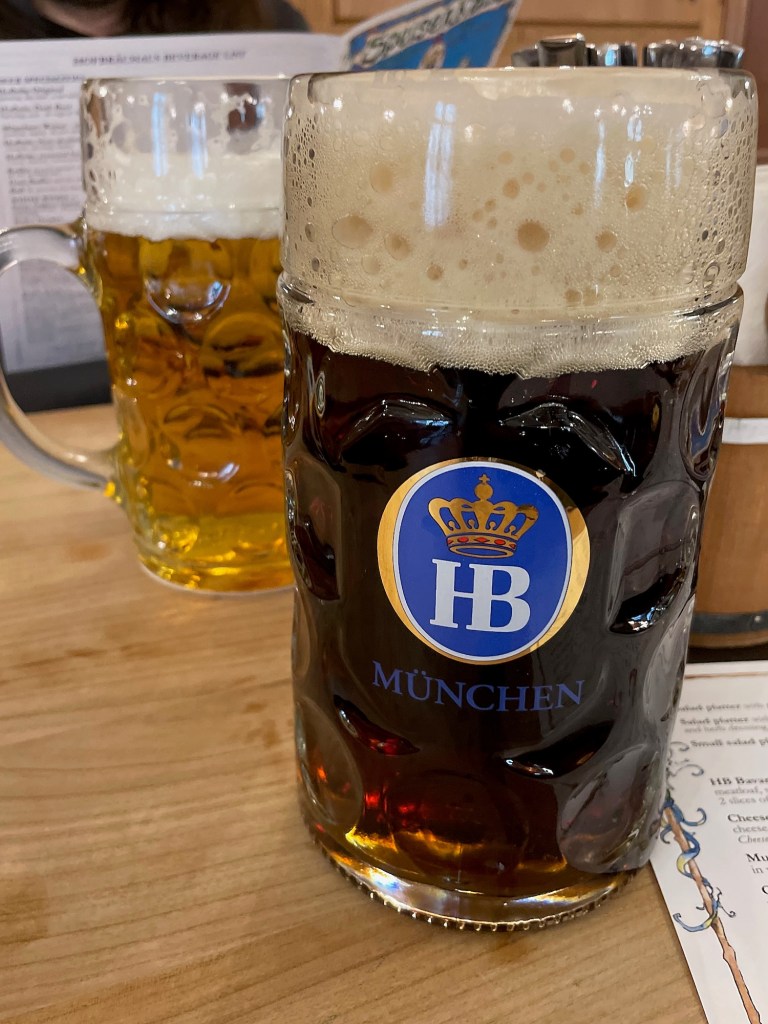 My coworker and friend, Kris, joined me on my venture to Hofbrauhaus. As soon as we turned the corner and I saw the crowned HB on a building, I recognized it from a stoneware beer stein we’ve had in our house my entire life. I always liked it because my dad and mom are Henry and Beth: HB.