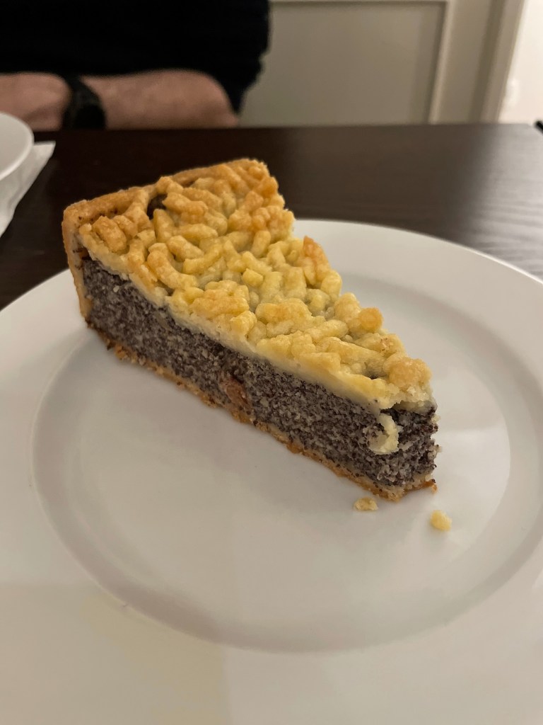 I could barely walk when we left, I was so full. And we were due for cake in 30 minutes with our teammates. So we set out on foot again and headed for the cake shop, Konditorei Erbshäuser, where we shared 5 pieces of cake among 4 of us: Prinzregententorte (many thin layers), Sachertorte (my favorite! all chocolate), almond cheesecake, apricot cheesecake, and Mohnkuchen (German poppy seed cake). It was raining when we finished, but we walked through the rain to another shop anyway before catching an Uber back to the hotel.