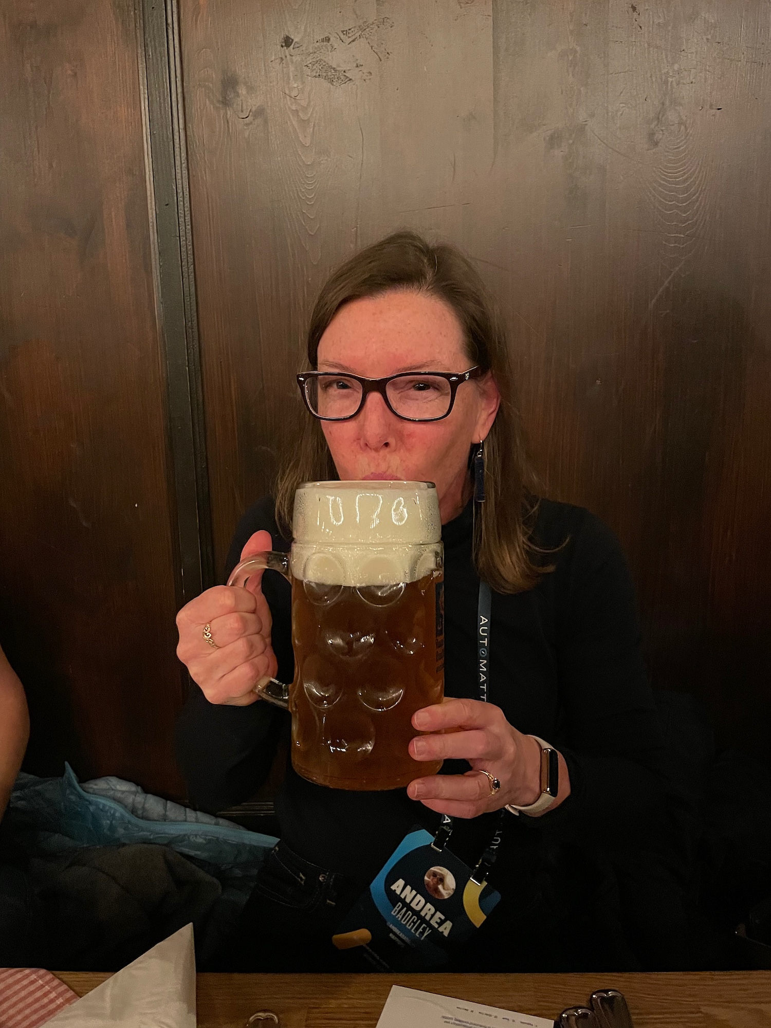 Since I couldn’t find Mom’s high school the day before, I asked her for any other landmarks to visit. She remembered the Glockenspiel, and she also told me about a beer house she used to go to — Hofbrauhaus — where she could get a liter of beer for 50 cents. So the second day, that was my primary quest. My team lead also told us that Germany is good at cake, so we needed to also meet for cake. That was my secondary quest. First beer, then cake.